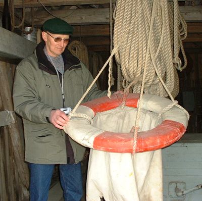 Så tar Thore oss med ut i redningsbua. Her får vi se raketter og utskytningsstativ, og en demonstrasjon på hvordan utskytningslina legges opp på et brett med styrepinner, slik at det ikke skal komme kink på lina. Vi får prøve redningsstolen utført i solid seilduk. Det moderne redningsgeværet med en tynnere utskytingsline, skiller seg fra det øvrige utstyret ved at det er lett og hendig i bruk. Fra taket henger svære kveiler med grovt tauverk. Og ellers er her kasse på kasse med utstyr som fortsatt står klare til å lesse på kjerrer, ........