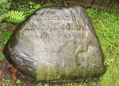 Reidar Solum er gravlagt på Vår Frelsers gravlund i Oslo. Tittelen ambassadør er benyttet på gravminnet.