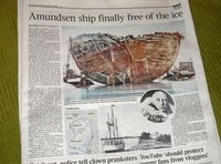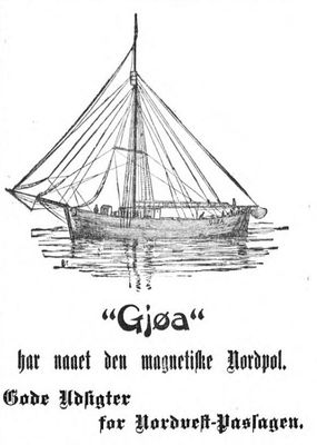 Faksimile fra Aftenposten 12. mai 1905 (morgennummer): Omtale av status for Roald Amundsens ekspedisjon med Gjøa, at man har nådd den magnetiske nordpol, ekspedisjonen fant sted 1903-06. Gjøa er fra 2013 utstilt i et eget bygg tilknyttet Frammuseet i Oslo. Skipstypen er en jakt bygget ved Knut Næs i Rosendal i 1872.