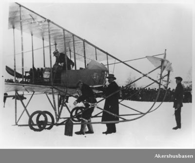 På Kjeller 1914: Oppe i flyet ser vi kaptein Einar Sem-Jacobsen. Roald Amundsen er mannen som bøyer seg mot bensinkanna. MiA.