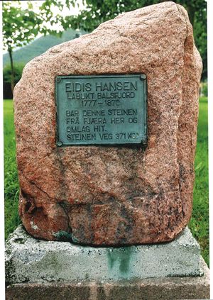 Dette må være et av de mest originale minnesmerkene i Tromsø. Eidis Hansen var født i Balsfjord i 1777 og skal angivelig ha vært meget syk og svak da han ble født. Det vokste han av seg, for han utviklet seg til å bli en kraftkar det gikk gjetord om. Det går mange historier om Eidis Hansens fantastiske krefter, men den mest kjente er knyttet til steinen som står på Roald Amundsens plass.