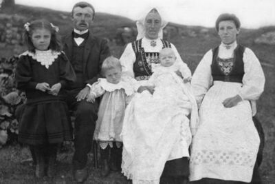 Frå venstre: Aslaug, Anders, Elisa, Aletta (søster til Elisa). Framme Ågot, Gudmund Solheim (vaks opp her) - Rognsvågen rundt 1910.