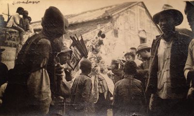 Demonstrasjonstog i byen Swatow, Kina, på 1930-tallet. Byen heter Shantou i 2019. Midt på bildet en kinesisk pike pyntet med blomster og silke på en hvit hest.