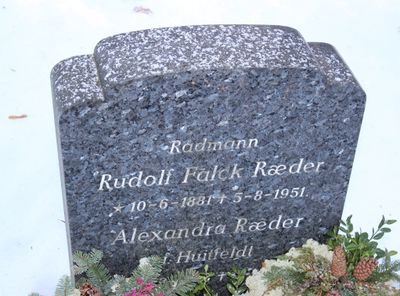 Rudolf Falck Ræder er gravlagt på Ullern kirkegård i Oslo. Tittelen Rådmann er benyttet på gravminnet.