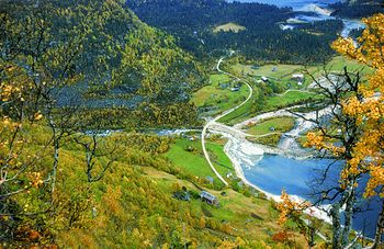 Ryningen er den næraste garden på dette biletet av Skarg. I bakgrunnen ser ein Holen. Elveløpet vart lagd om i 1965, så biletet er teke etter det, men truleg fyre 1970. Skargjesåni grov ein heil del etter omleggjinga. Bilete frå Setesdalsmuseet.