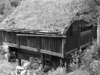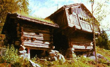 Ryningsloptet, som er eldre enn 1648, står i Huldreheimen. Sidan lendet gjer det ugreitt å fotografere det frå framsida, er dette biletet teke attantil. Huset på hitsida av loptet er eit kvernhus frå Vodden, Nesland. Bilete frå arkivet til Bykle kommune.