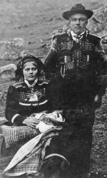 Pål Åsmundsson Ryningen (1882-1932) og kona, Birgit Olavsdotter, fødd Trydal (1887-1936). Dei gifte seg i 1907. Her er dei fotograferte hausten 1908 saman med den nyfødde Åsmund. Bilete frå Alfred Ryningen.