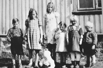 Barneflokk frå Ryningen og Holen sumaren 1945. Frå venstre: Olav, Ingebjørg, Birgit, Pauline, Ingebjørg M. Holen, Olav M. Holen og fremst Ånund Ryningen. Bilete frå Ingebjørg Vegestog.