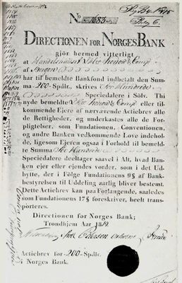 Norges Bank var organisert som eit privat aksjeselskap. Grunnfondet var fastsett til mellom 2 og 3 millionar spesidalar sølvverdi. Innskota som kom inn av sølvskatten, vart rekna som aksjar, og det vart utferda aksjebrev for alle innskot over 25 spesidalar. For mindre innskot vart det berre gjeve såkalla interimskvitteringar.