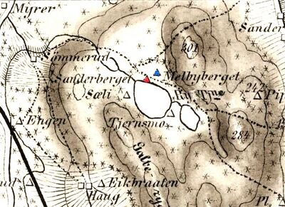 | Husmannsplassen Søndre Melbyberget avmerket på kart fra 1800. Kartverkets historiske arkiv. | |