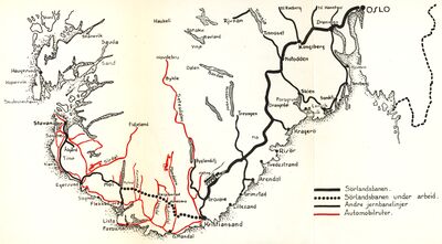 - Sørlandsbanen på Wikipedia på bokmål og riksmål.