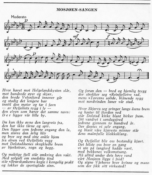 - ↑ Helgeland Arbeiderblad 30.07.1973: Mosjø-sangen har fått ny melodi