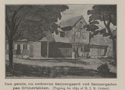 Den gamle Sannergården. Illustrasjon fra boka Gamle Christiania-billeder av Alf Collett, 1893.