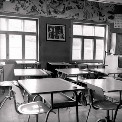 Seljedalen, Vik, Sogn og Fjordane, bygd 1870. Interiør frå klasserom med pulter i skulehus. Registrering utførd 1958-59 av Johan Schiong for Noregs Lærarlag.