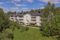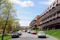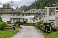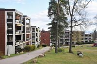 - Furumoen borettslag på Øståsen i Nordre Follo, boligblokk fra 1967. Dette var den første blokkbebyggelsen oppført av Selvaagbygg i Follo.Foto: Leif-Harald Ruud (2022).