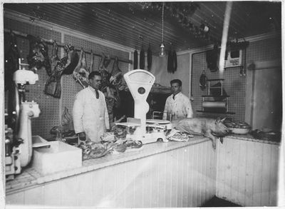 Sigvart Olsen Løkens kjøttforretning i Lillestrøm fra omkring 1930 og 1950-åra.