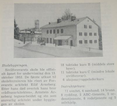 Arkitekt for Sivilforsvarets skole var opprinnelig Eilif Arneberg, bror av den mer kjente arkitekten Arnstein Arneberg. Da Eilif Arneberg døde før fullførelsen av bygget, tok broren Arnstein over arbeidet, og ble utførende arkitekt for skolebygningen.
