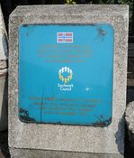 På plassen foran kirken finner vi også en minnestein over Norges falne. Steinen har hovedpåskriften "Våre falne", og inneholder de siste linjene i Nordahl Griegs dikt "17. mai 1940": "Vi er så få her i landet/hver fallen er bror og venn/Vi har de døde med oss/den dag vi kommer igjen". Her finnes også en egen minnestein over norske omkomne sjøfolk under 1. verdenskrig.