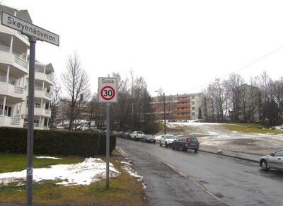 Veien er (nordfra) tilstøtende til Klinkerveien, Skøyenkroken og Løypeveien.