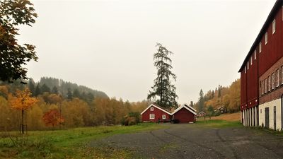 Skarva fotografert mot Bærums Verk og Kristiansjordet. Driftsbygningen til høyre tilhører Bærums Verk.