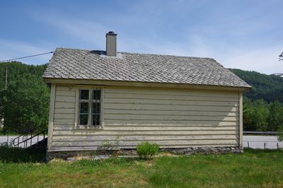 Skilbrei gamle skule, ved E-39. Skilbrei, Gaular, Sogn og Fjordane. Lite kvitt skolehus ved veg, sett frå baksida. Bygd i 1895 eller 1900. Registrering utført 1958-1959 av Johan Schiong for Norsk Lærarlag.