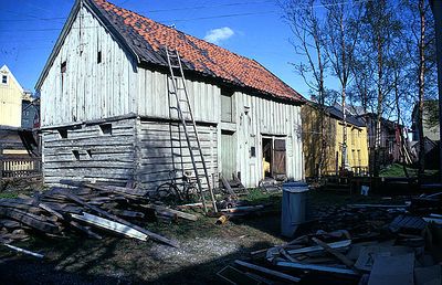 Bakgården til nr. 44, den gule sjåen hører til nr. 46. I 1972.