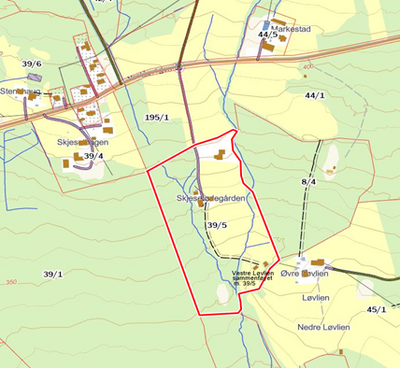 | Utskilt: | 39/2 Vestre Løvlien, etablert 1909, 39/5 Skjesetødegården, etablert 1935 Sammenføyet 2005 |