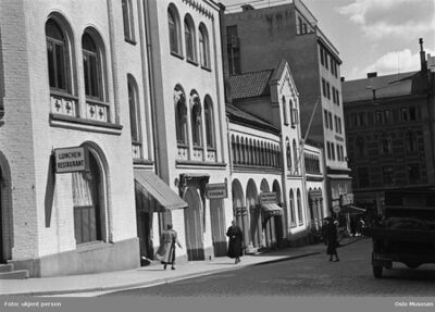 Gata før krigen med Christiania Dampkjøkkens bygninger. Lunsjrestauranten til venstre, utsalgene i midten og den nye gården Torggata 8 nederst.