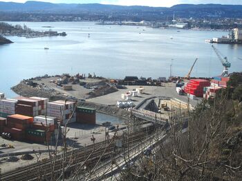 «Håkon selv og størsteparten av hæren skulle gå i land under Ekeberg sønnenfor Trælaborg og komme til byen sørfra» (fra Håkon Håkonssons saga). Kongshavn og Grønlia i 2013; området er veldig forandra siden middelalderen.