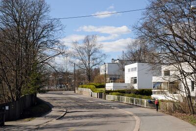 | 95 | 1963 | Villa/eneboliger | Villa og sju mindre eneboliger (adresse 95B–H) i tegl, arkitekt Beng Espen Knutsen. Tidl. Jagtvillaen, lafta tømmerhus i dragestil, revet tidlig i 1960-åra. | |