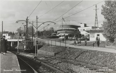 Et eldre bilde fra stasjonen og krysset med bygningen Handelssentralen fra 1930-årene i bakgrunnen.