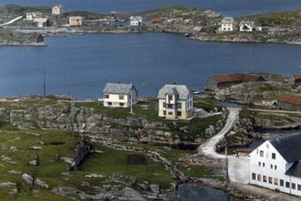 | Flyfoto 1961. Bak frå venstre Kongestølen, Muleide og Mulen (bnr 38 og bnr 14). Framme frå venstre Kremmarholmen bnr 60, bnr 62 og bnr 47 (Bjelland). Foto: Widerøes Flyveselskap