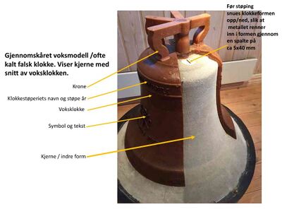 Støpingen er ved hjelp av en såkalt «falsk klokke», det vil si en klokkeform laget av voks eller talg. Border, tekst og symboler støpes eller skjæres ut i voks og påsettes voksklokken. Denne ble laget rundt en indre form/kjerne som ble murt opp over en tremodell (kalt lopen) med egenproduserte formsteiner i sand, leire, blandet med kuhalehår som holdt det hele sammen og ga små luftekanaler etter brenning av formene. Under støpingen ga disse kanaler avlufting for støpegassene.