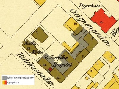 St. Josephssøstrene kjøpte villaene i Ridehusgaten 22 og 24 og flyttet hospitalsvirksomheten dit. Dette ble St. Josephs hospital og etterhvert ville hoveddelen av dette kvartalet opptas av virksomhet tilknyttet den katolske kirke på en eller annen måte. Den første pasienten søstrene tok seg av hadde difteri og ble pleiet fra 24. august 1887. Rundt to måneder senere ble den første hospitalsbygningen åpnet, den hadde fire senger. 7. april 1888 ble en mor med sitt nyfødte barn den første innlagte pasienten.