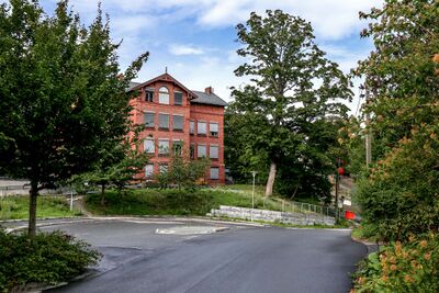 Parti fra Stanga i Bærum med Evje skole i bakgrunnen.