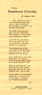 Før 10-årsjubileet i 1944 sto det litt strid om feiringa. Styret mente den måtte utstå til seinere. Det var «ingen mening i å arrangere 10-årsfest i disse knappe tider». Dette vedtaket ble nedstemt på kormøtet den 28. sept., og resulterte i en sangaften for medlemmer og innbudte i Nasjonalbrakka. Til denne markeringa skrev Ågot Hammer også en sang, men på grunn av teksten og tidens forhold signerte hun bare med «jubilant».