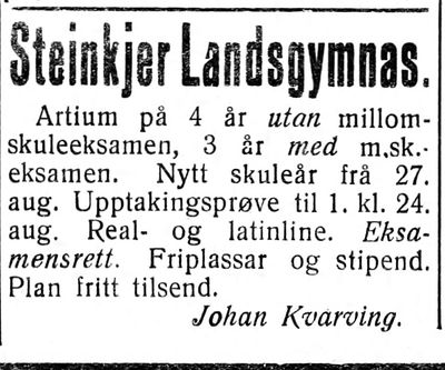 Johan Kvarving var rektor i hele landsgymnasets levetid, og fortsatte som rektor ved Steinkjer gymnas fram til 1982.