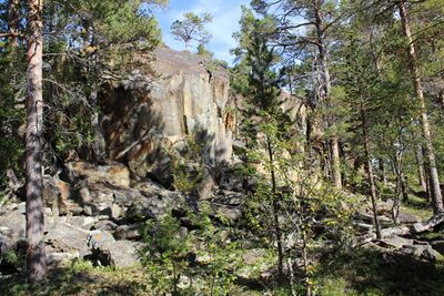 I nedkanten av berget er det større og mindre lausbrotne steinblokkar Nokre av desse har tydelege merke etter bruk av bor, der det kan ha vore brukt krut.