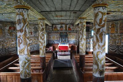 Fra utsiden ser kirken ganske ordinær ut, men innvendig er den rikt dekorert med rosemaling på vegger, søyler, galleri og i taket. Rosemalingen er i renessansestil fra 1700-tallet, med tema over ranker og drueklaser, snirkler og roser i solgul og himmelblå farge. Den ble utført av Webjørn Maler og Anders Reinholdt. Til dekormalingen er det brukt limfarge.