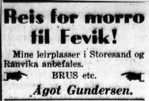 Sommersesongen 1942 åpnet den 14. mai. Ågot Gundersen reklamerte i Agderposten med brussalg.[20] I august annonserte hun: "Storesand: Min funkisdisk i Ranvika tilleie som tomannstelt. Ågot Gundersen."[21]