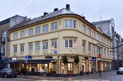 | 7 | Gnr. 173/129 Bygningen markerer det spesielle gateløpet til Torggangen, «Pølsesvingen», som gikk langs husets vestside. Trygve Lie Møbelfabrikk A/S holdt til her før bedriften flyttet til Pindsle indudtriområde. | |