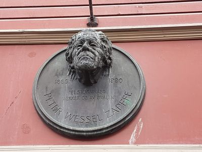 I 1920: Apoteker Fritz Gottlieb Zapffe med kona Gudrun Wessel, datteren Signe Wessel og sønnen Peter Wessel Zapffe (student), samt pleiedatter Lydia Kristine Jakobsen og tjenestepike Ingeborg Antone Johansen.