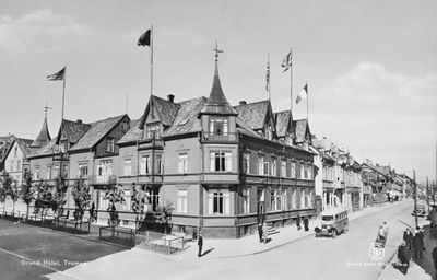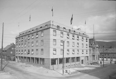 Grand hotell etter gjenoppbyggingen mot Grønnegata/Strandskillet i 1949.
