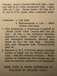 Firmaet presenterte seg med både norsk og engelsk tekst i en meget forseggjort albumutgave rundt 1930. Presentasjon har i dag interesse som historisk dokumentasjon, og viser at bedriften allerede på dette tidspunkt kunne fremvise omfattende leveranser til inn- og utland. Teksten gjengis her i sin opprinnelige språkdrakt - bildene er plassert annet sted i artikkelen: