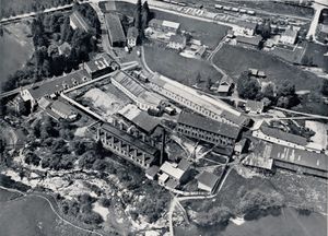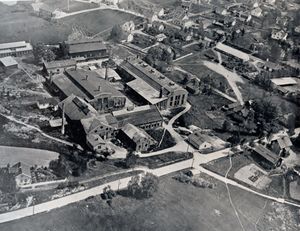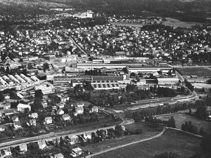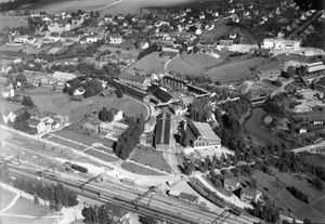Strømmens Værksted fra sørvest 1938 med Strømmen stasjon i forgrunnen. |