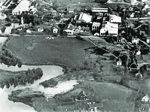 Fra Sagelva ved Strømmens Værksted, sett fra Slora. Stasjonsveien (Jernbanegata) var ikke bygd ennå, isteden gikk veien via demningen ved verkstedet i bakgrunnen. Huset til høyre var ifølge O. Krums kart 1905 eid av støperimester Karl Brynildsbakken. Huset står fortsatt i Stasjonsveien 5 og huser nå Fastlegethuset.