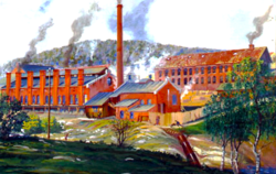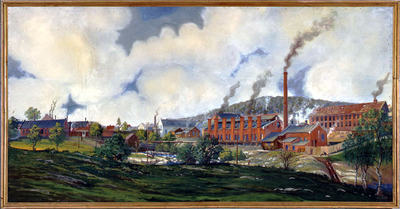 Strømmens Værksted med Sagelva i forgrunnen. |