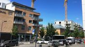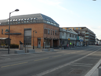 Strømsveien gjennom Strømmen sentrum 1920. Til venstre Folkets Hus fra 1910, videre Strømmens Værksted, og i bakgrunnen Bråte gård.