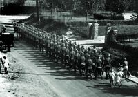 Tysk tropp foran Sagdalen skole 11. april 1940, fotografert av meieribestyrer Reidulf Nordmo.