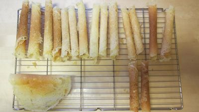 - Stek løvtynne strull av en god spiseskje røre i krumkakejernet.